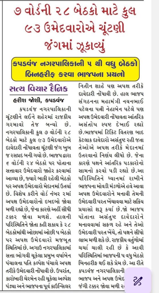*સત્ય વિચાર દૈનિક* દ્વારા અગાઉ જે અનુમાન લગાવવામાં આવ્યું હતું કે આ ચૂંટણીમાં પાંચ ઉમેદવારો બિનહરીફ જાહેર થશે, તે અક્ષરશઃ સાચું ઠર્યું છે. ફોર્મ પરત ખેંચવાના અંતિમ દિવસે ચિત્ર સ્પષ્ટ થતા જ કપડવંજ નગરમાં પ્રથમ વખત અનોખો રાજકીય ઇતિહાસ રચાયો છે.